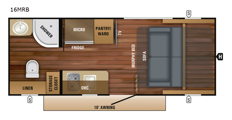 For the couple who enjoys time away from home but prefers the convenience of sleeping in a camper and being able to prepare your meals indoors, then this Hummingbird 16MRB is for you! Depending upon the time of day that you enter this trailer will determine whether you see the sofa along the front wall or the Murphy bed. Many people really enjoy how convenient and "out of the way" the Murphy bed is during the day! Throughout this model there is plenty of storage with the overhead cabinets. Outside you will enjoy the shade from the power awning with LED lights, so now you can enjoy a quiet evening outdoors. Maybe you want a little music, that's not a problem since there are (2) marine grade exterior speakers!