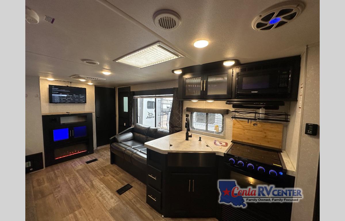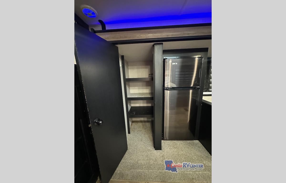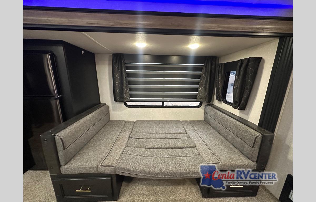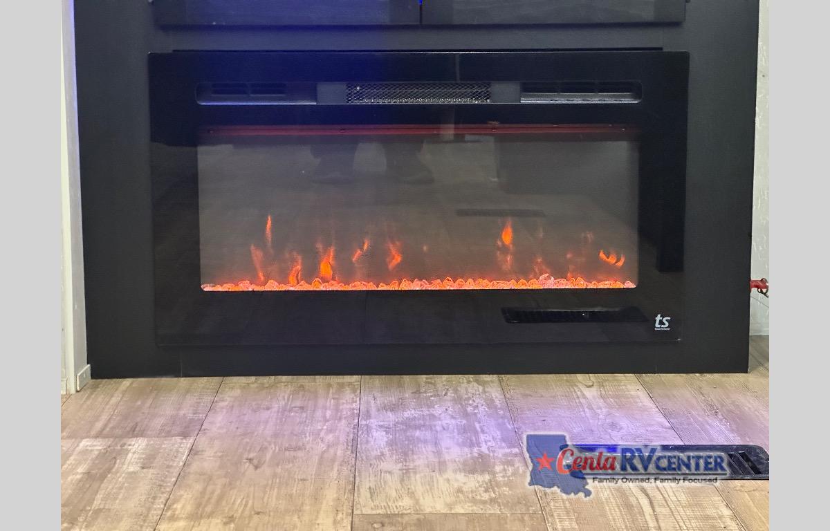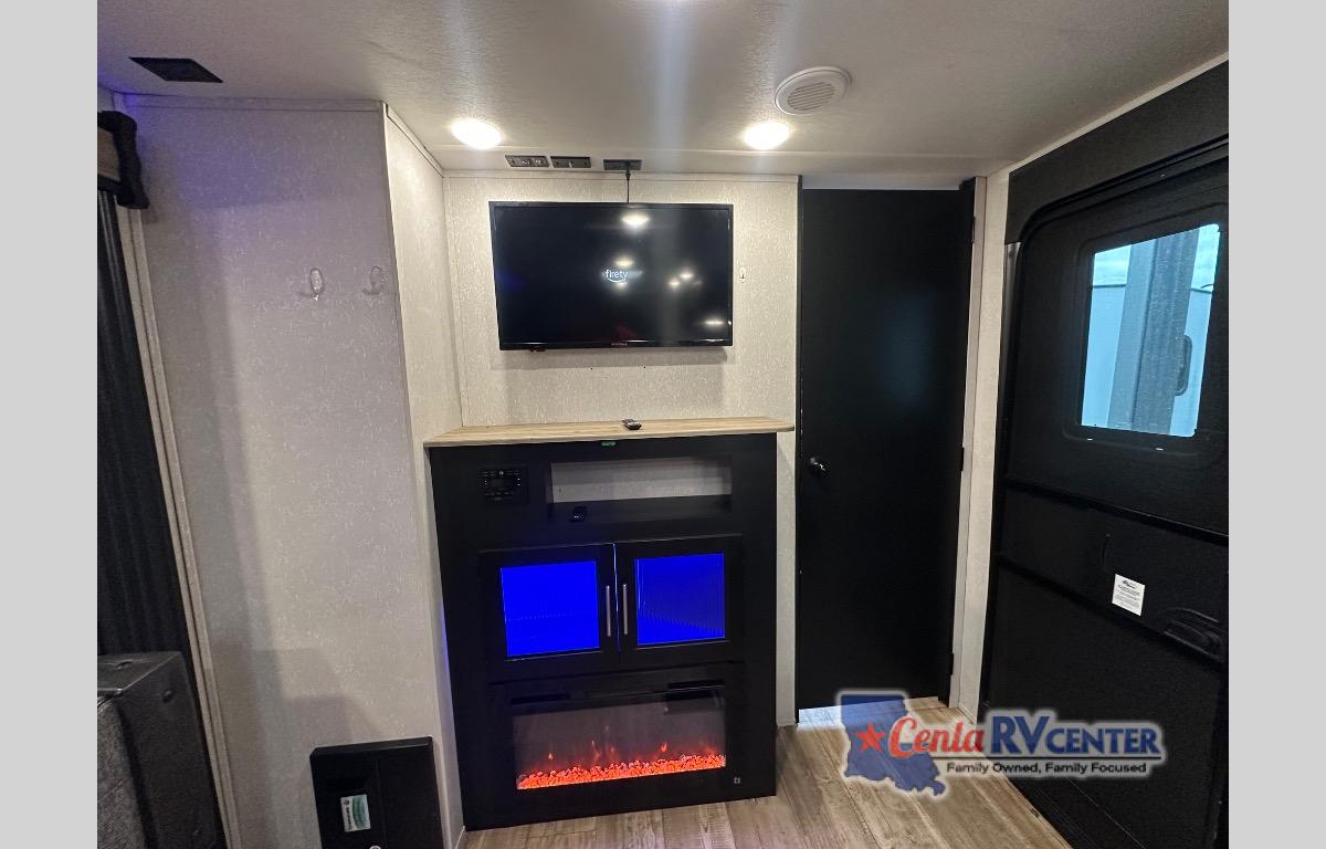 This unique layout allows you to relax in the living area on the sofa or U-shaped dinette while enjoying the fireplace and picture window, just steps away from the kitchen amenities including a farm sink, full-size pantry and residential refrigerator. The cook will also enjoy having an outside kitchen to make a few meals which includes a refrigerator, a stovetop, hot and cold sprayer and an icemaker. You will also appreciate the dual entry for convenience and safety as well as the double-size bunks that sleep four. And you will have your own walk-around queen bed with dual wardrobes and more storage when you want some privacy.