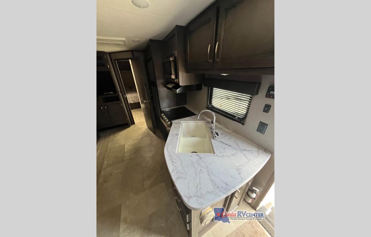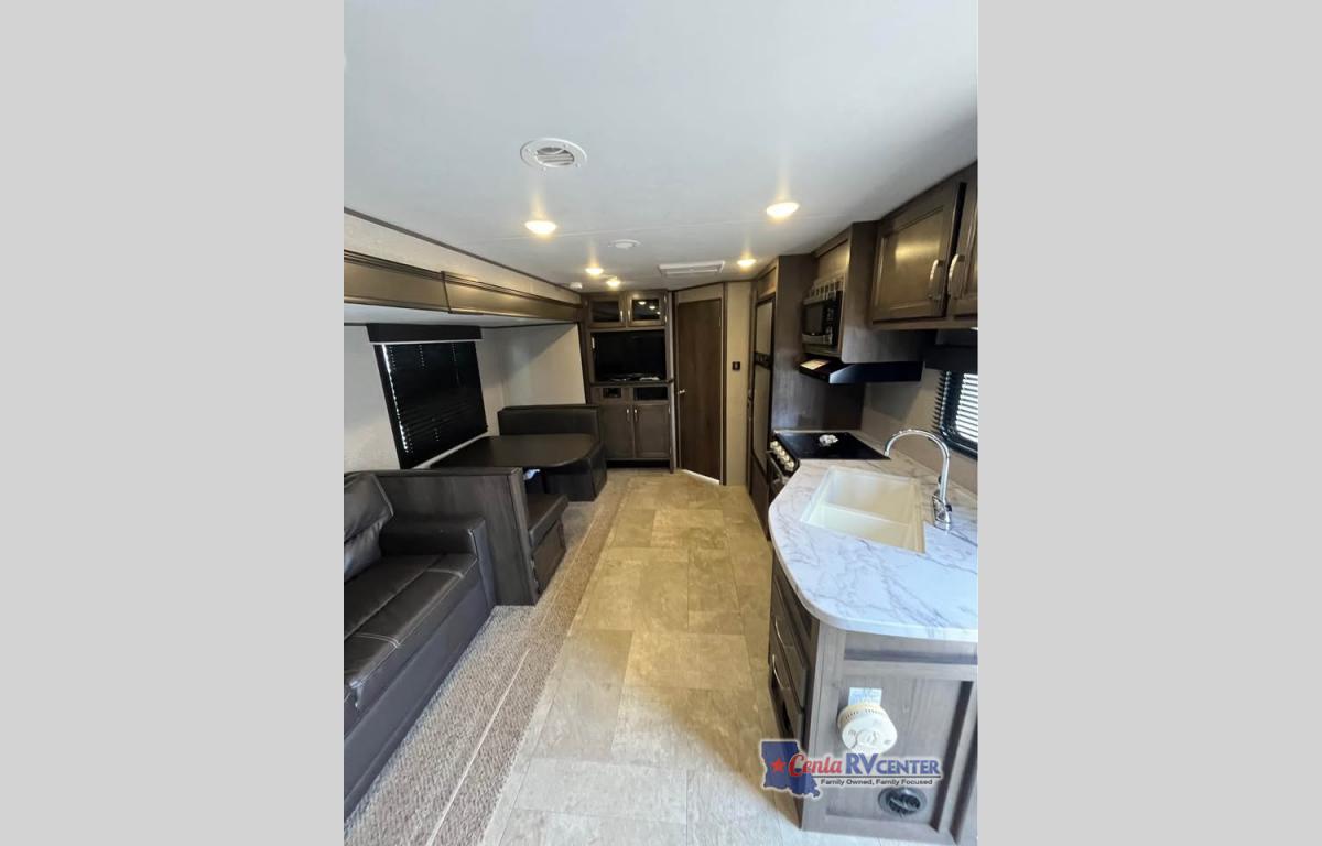 Find your favorite campsite and load up this travel trailer! With dual entry doors, you will experience a smooth flow of traffic in and out of the unit, plus one of the entrances leads directly into the front private bedroom. The bedroom has a queen bed with wardrobes on either side to keep your clothes looking their best and has an entrance into the walk-through bathroom for easy access at night. Grab the eggs and bacon from the 6 cu. ft. stainless steel refrigerator with temperature controls and fry them up at the three burner range glass top then enjoy eating it all at the booth dinette. If you ate a little too much then you can relax on the sofa or in one of the two swivel rockers before heading out to a fun day at the beach!