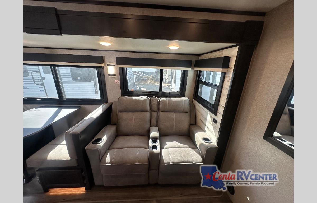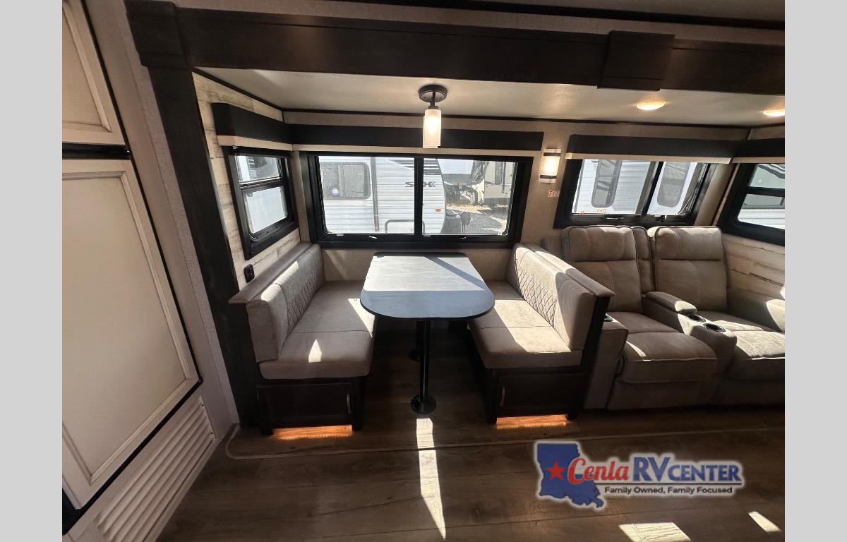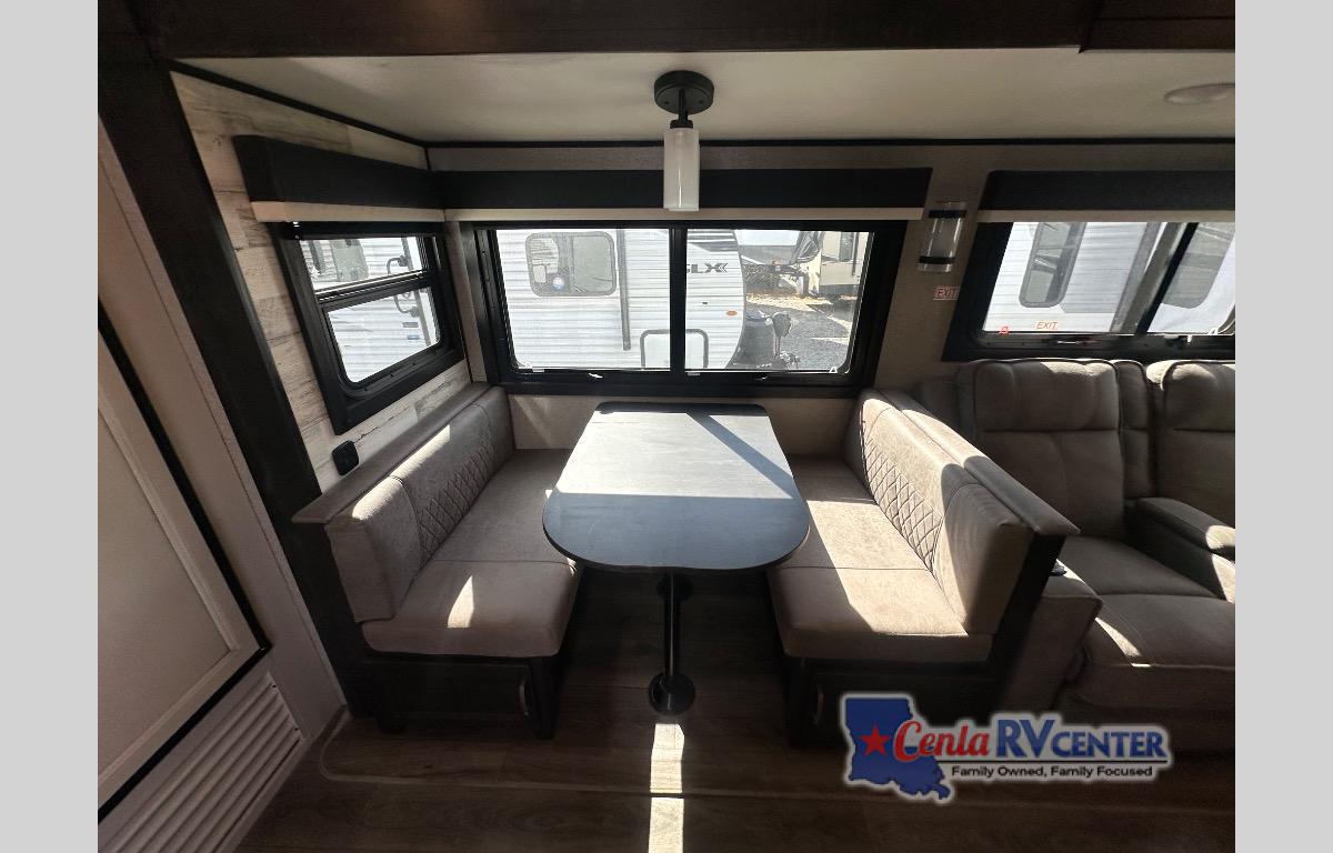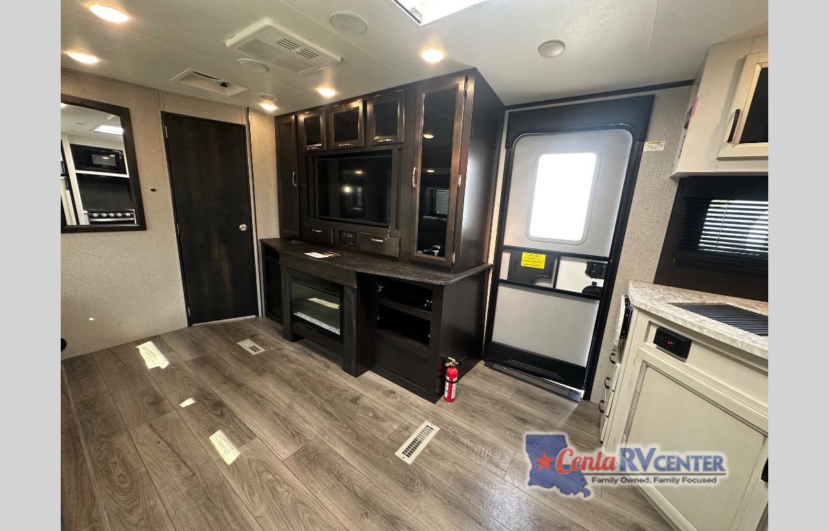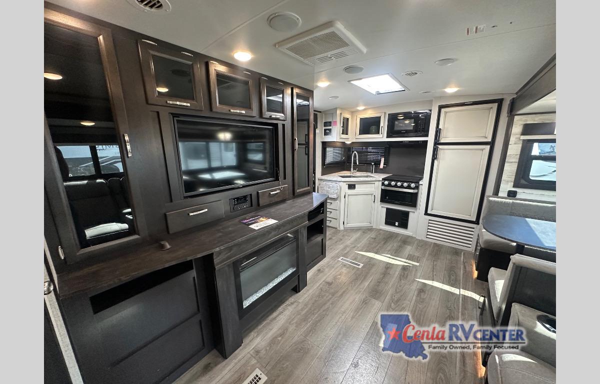 You will feel right at home in this travel trailer! The rear kitchen layout allows you to move about freely while you created a delicious meal with the three burner Furrion glass cooktop, the 8 cu. ft. refrigerator, and even the microwave. You can enjoy each meal comfortably at the booth dinette then play a card game or you can relax on the tri-fold sofa and enjoy the entertainment center with the electric fireplace and the 40" LED TV. You can start your days feeling clean and fresh by taking a hot, steamy shower in the glass 34" radius shower inside the walk-through bathroom, plus there is a linen closet and a small wardrobe for your storage needs. The front private bedroom offers a queen bed for a good night's rest with wardrobes on either side to keep your clothes neat, and even an entrance/exit door for you to slip out early in the morning for a quick fishing trip!