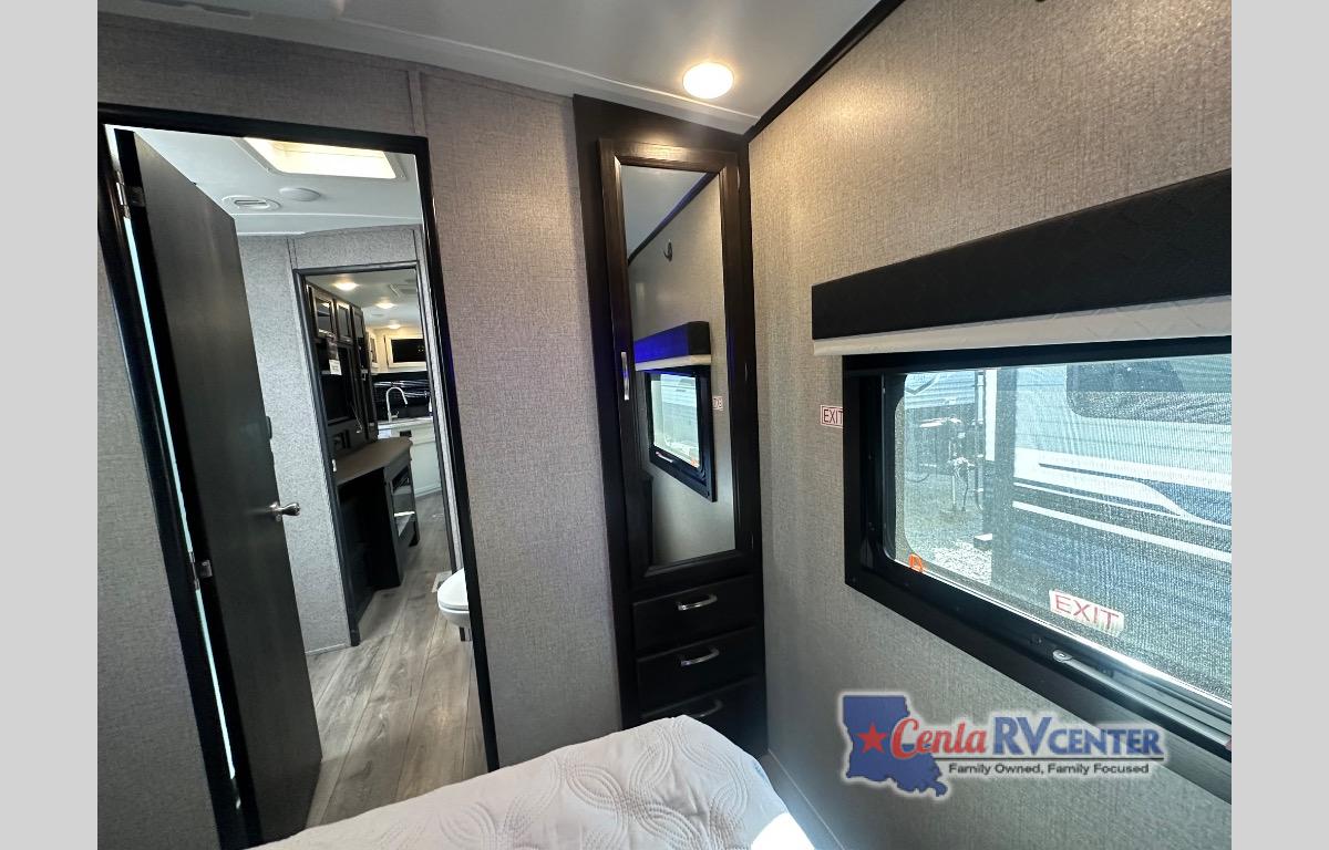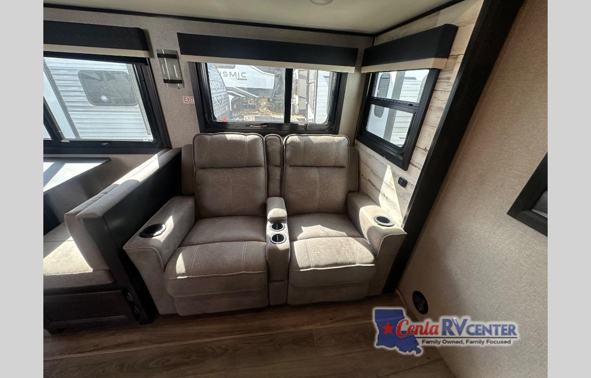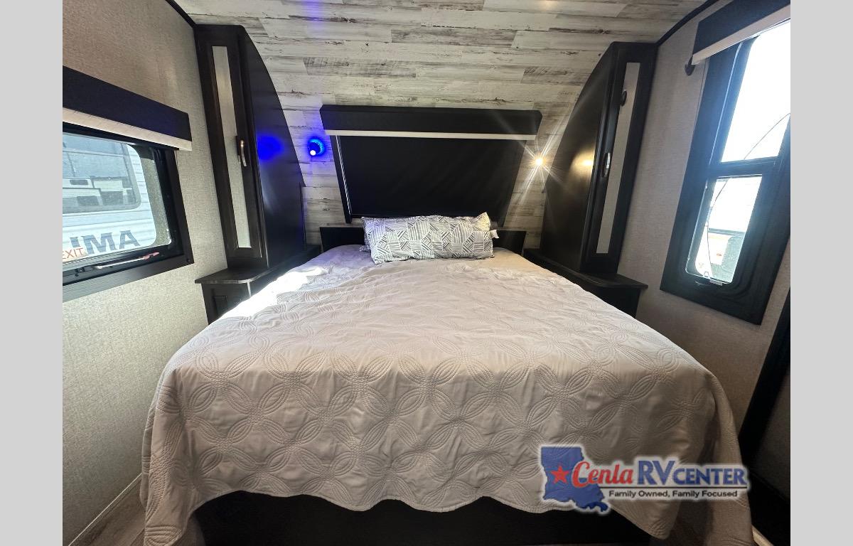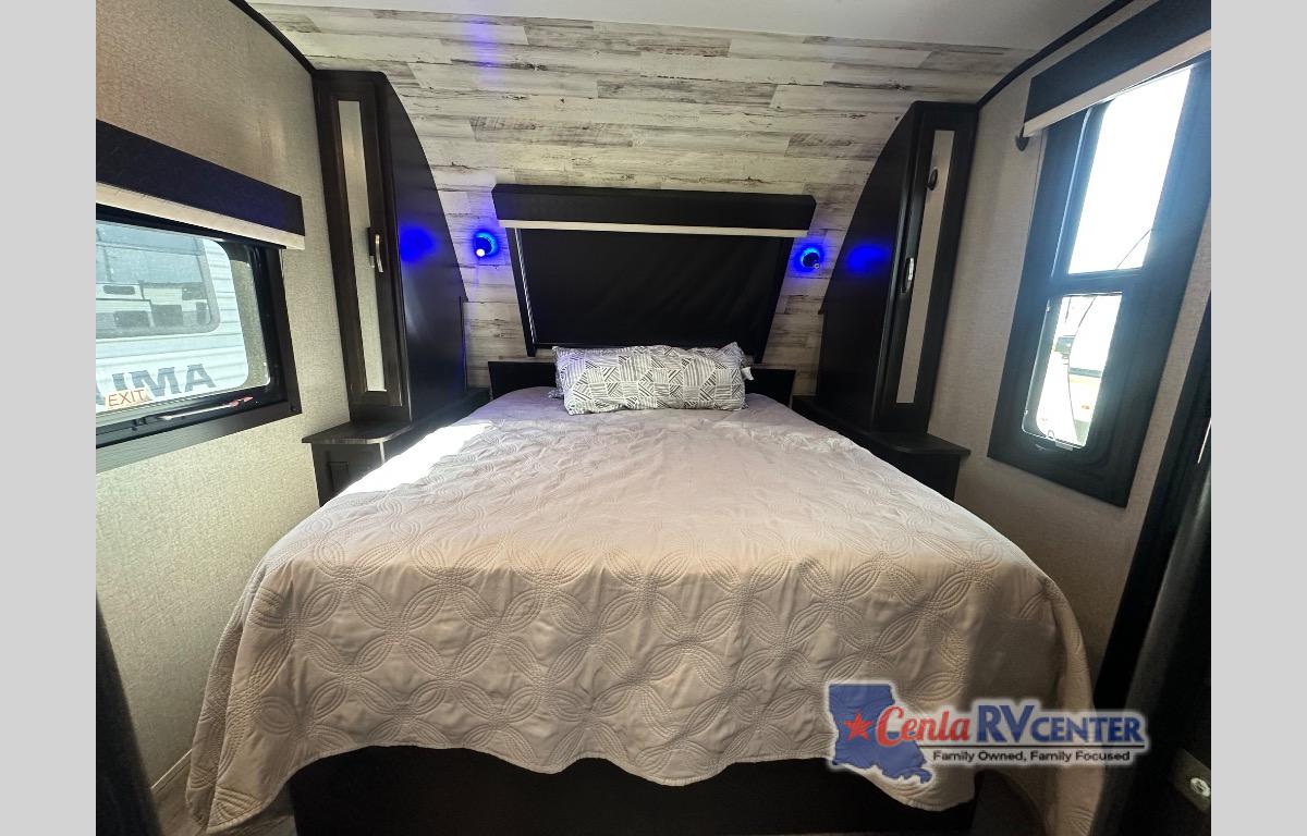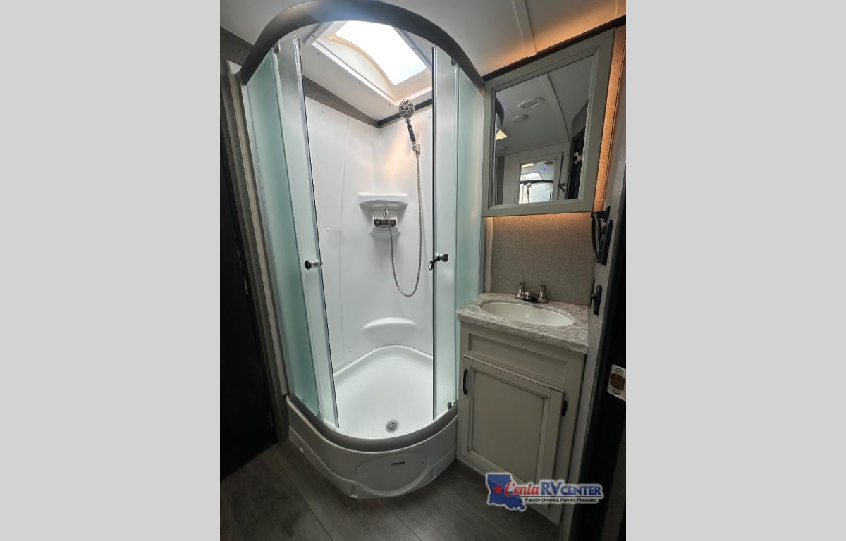 You will feel right at home in this travel trailer! The rear kitchen layout allows you to move about freely while you created a delicious meal with the three burner Furrion glass cooktop, the 8 cu. ft. refrigerator, and even the microwave. You can enjoy each meal comfortably at the booth dinette then play a card game or you can relax on the tri-fold sofa and enjoy the entertainment center with the electric fireplace and the 40" LED TV. You can start your days feeling clean and fresh by taking a hot, steamy shower in the glass 34" radius shower inside the walk-through bathroom, plus there is a linen closet and a small wardrobe for your storage needs. The front private bedroom offers a queen bed for a good night's rest with wardrobes on either side to keep your clothes neat, and even an entrance/exit door for you to slip out early in the morning for a quick fishing trip!