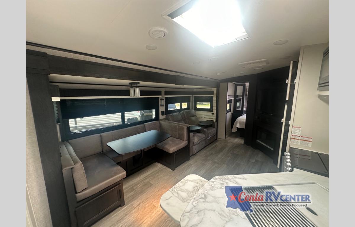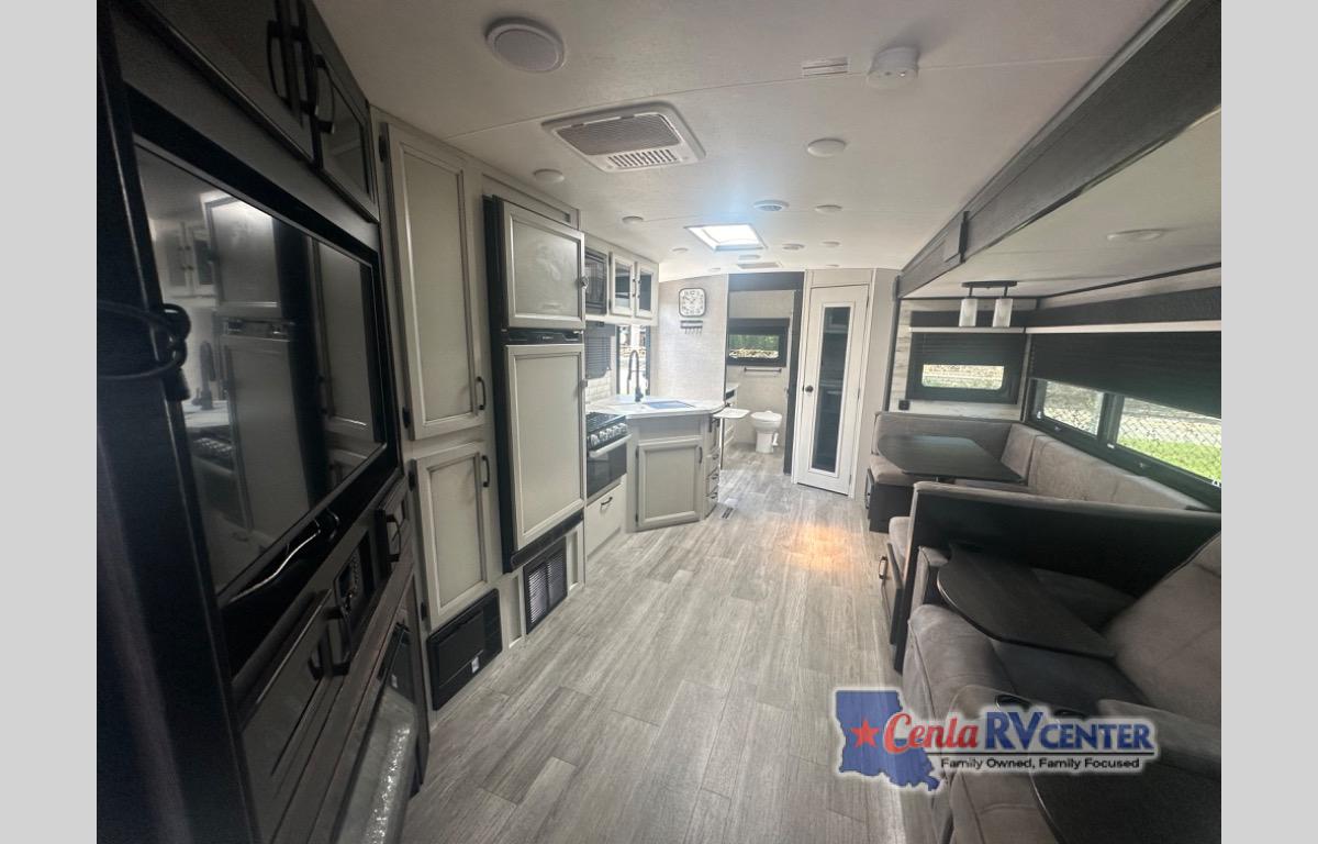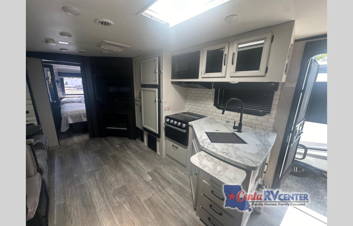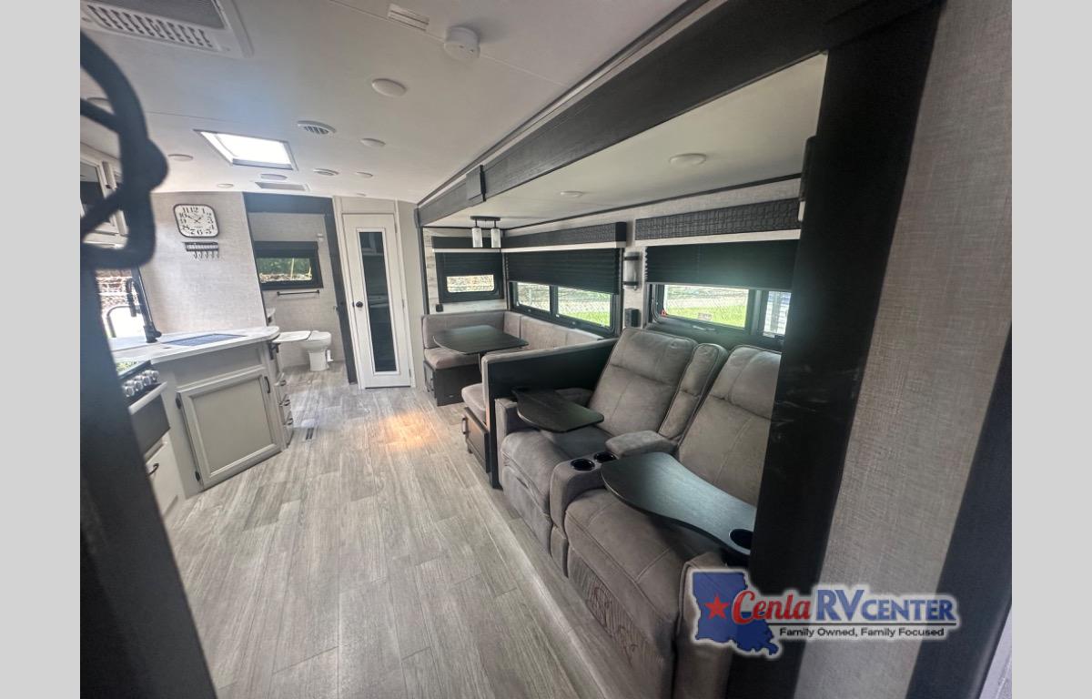 Your family will love camping every other weekend in this spacious travel trailer. The full rear bath is tucked away in the back for privacy, and there are dual entry doors for convenience. When you're not outside cooking on the outdoor kitchen, gather around the U-shaped dinette for game night. You'll find the LED TV and fireplace will make this area feel more like home, and there are two pantries to store snacks and dry goods. When it comes time to call it a night, head to the front private bedroom for a great night's rest on the queen bed, and you'll find two wardrobes plus a closet to keep your clothes tidy.