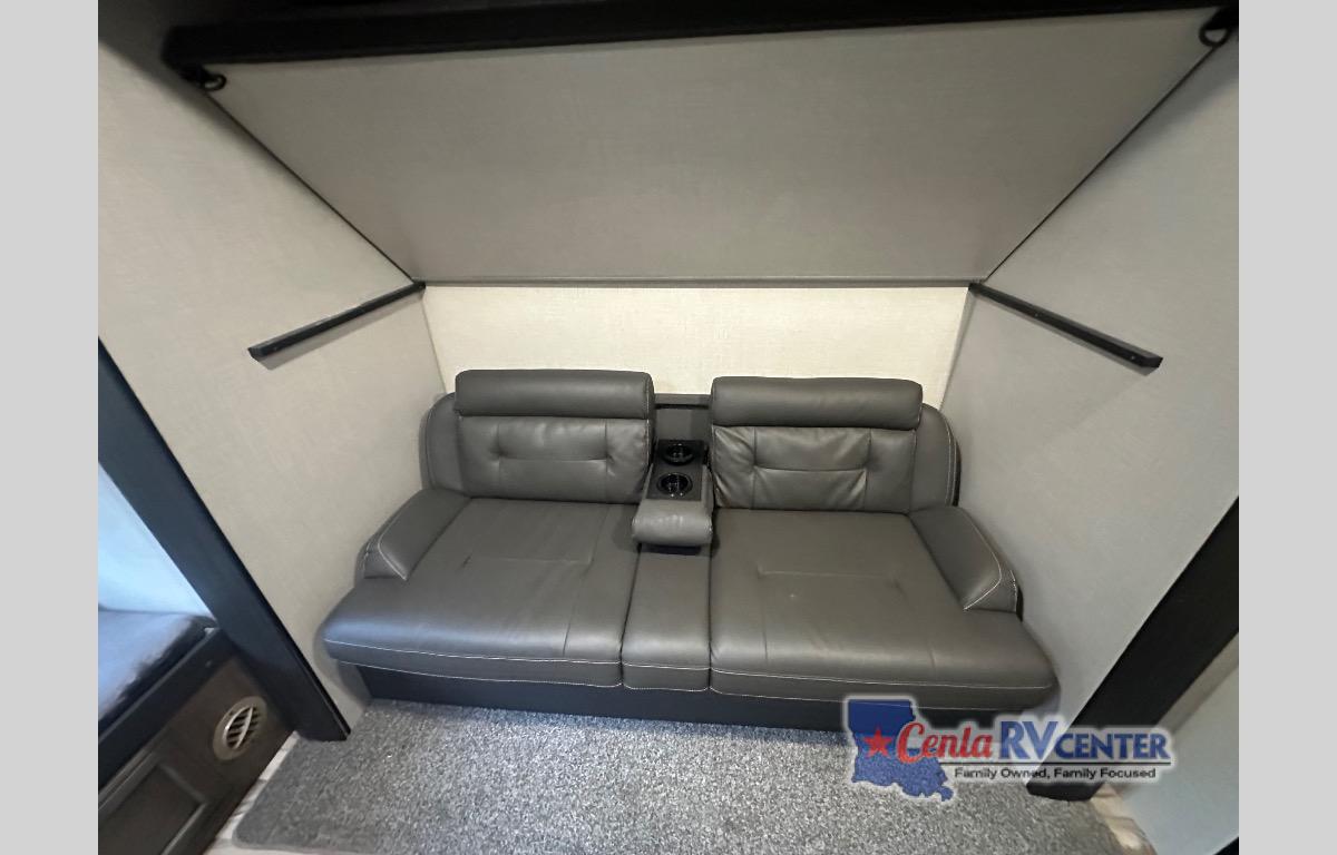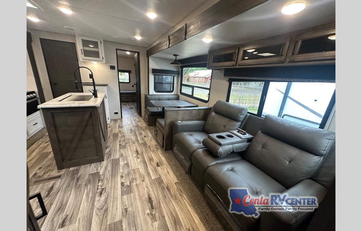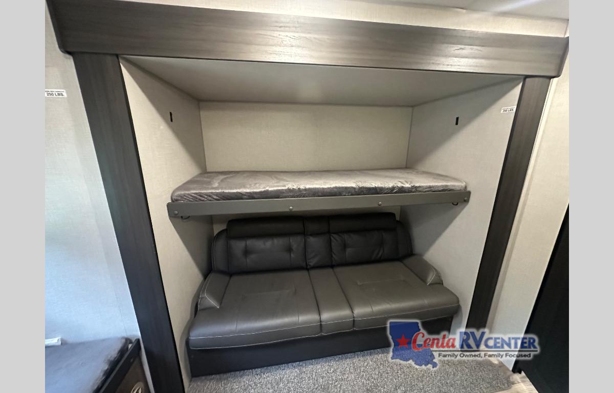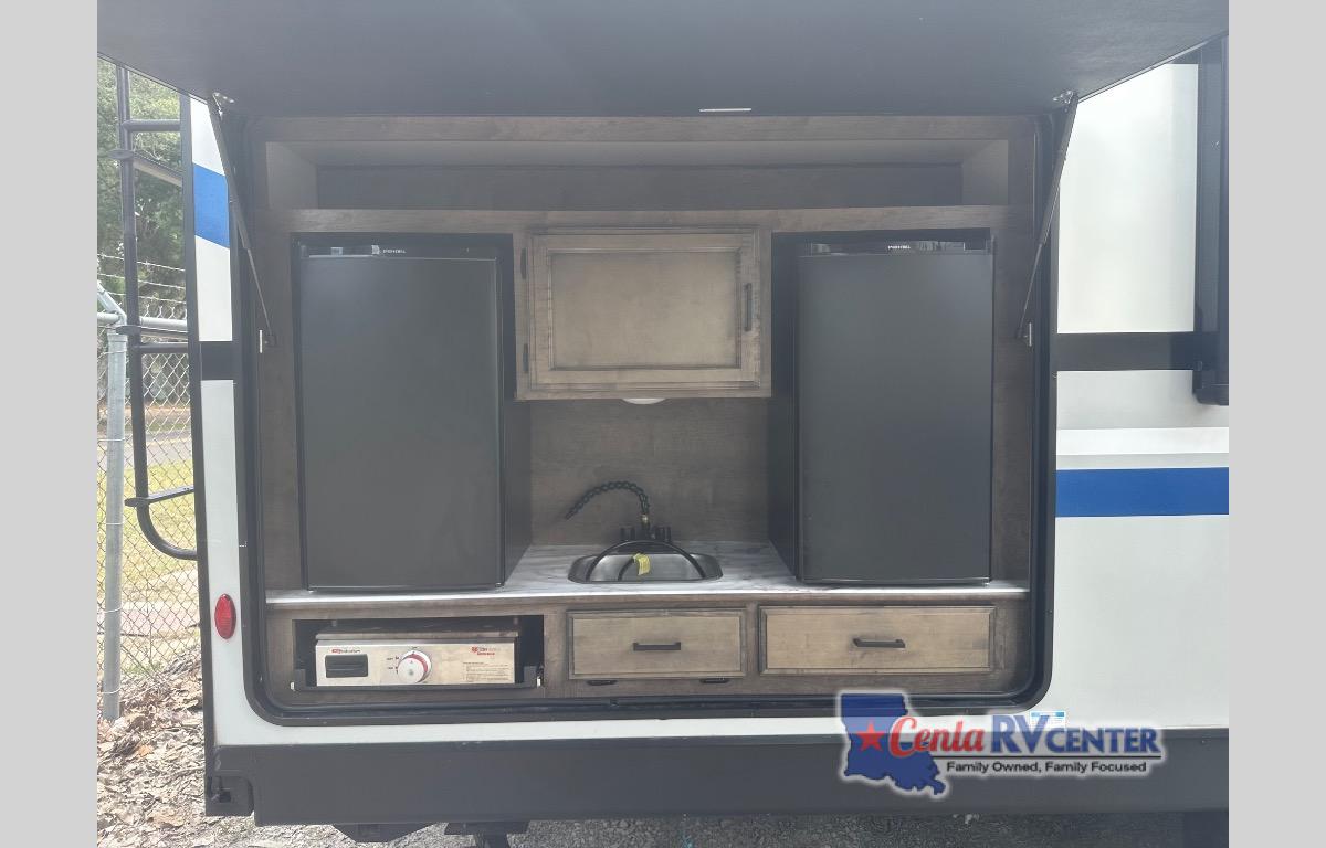 It's a clean decision with a bath and a half to take this travel trailer on your next camping trip! The rear private bunkhouse is decked out with a 28" x 70" bunk bed, a 32" x 70" top bunk, a 28" x 73" flip-up bunk above a 72" sofa with table, and a flip desk to do some school work. The half bathroom has an entrance/exit door so you can get back to cooking at the outdoor campfire café which has two 3 cu. ft. refrigerators, a sink, a griddle, and storage. Your clean up will be a breeze thanks to the kitchen island with a large sink and dish drying sink cover. If you need extra sleeping space then simply convert the 42" grand dinette and 70" sofa into sleeping spaces. Those staying in the front private bedroom will enjoy a good night's rest on the sleep tight queen bed and have the convenience of accessing the dual entry bathroom!