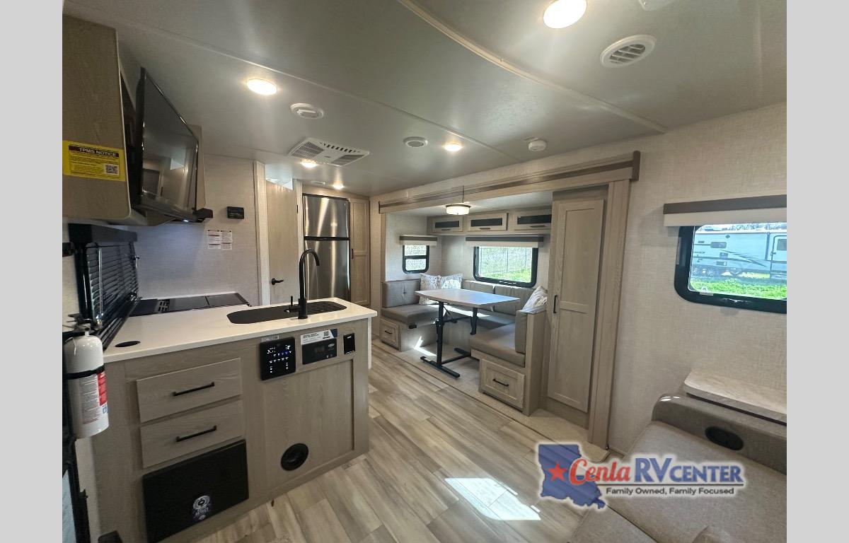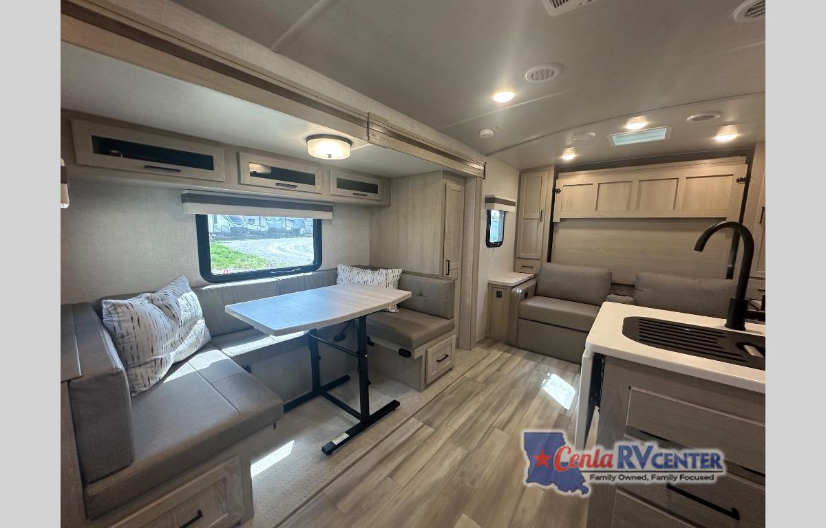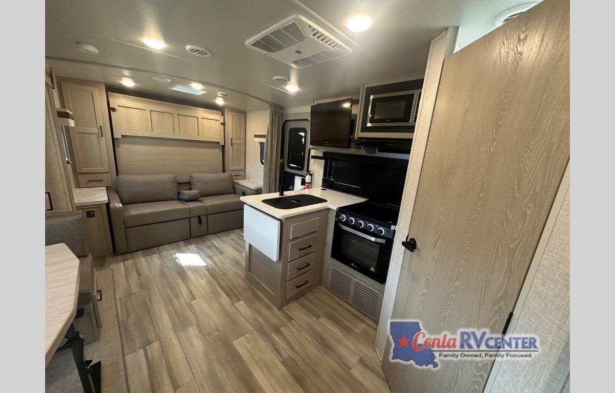 Versatile, cozy, and spacious are just a few ways to describe this travel trailer! Once you arrive at the campsite, unload your gear from the pass-through storage and additional exterior storage, then set up the 15' power awning with LED lights. You may want to visit in your camp chairs, or head inside to prepare lunch on the three burner cooktop. There is a U-shaped dinette within the slide out, plus a wardrobe here for jackets or your guests' clothes. You will also find the 72" sofa is a comfy spot to relax, and at night, you can fold down the RV queen-size Murphy bed!