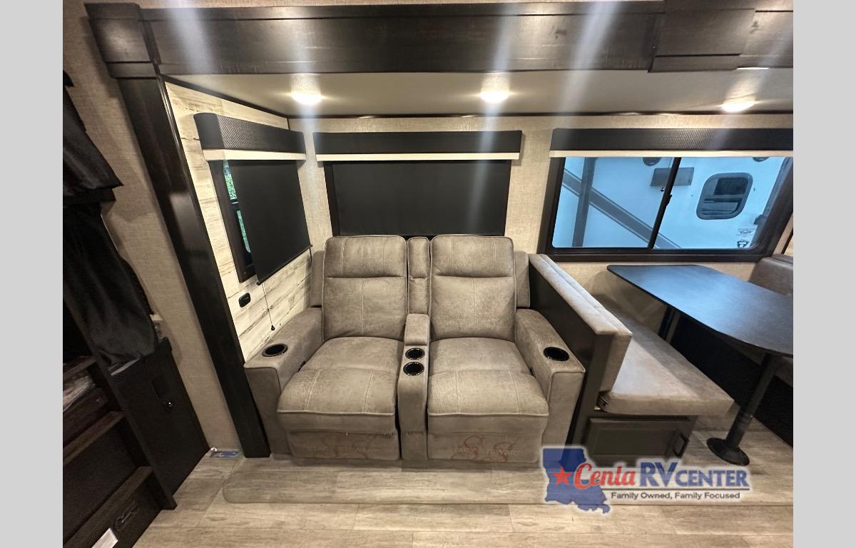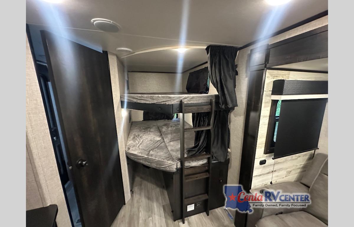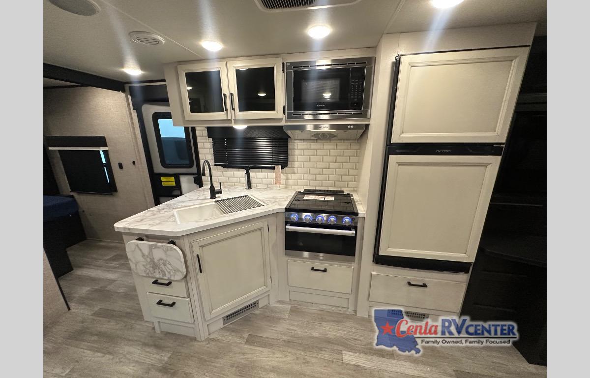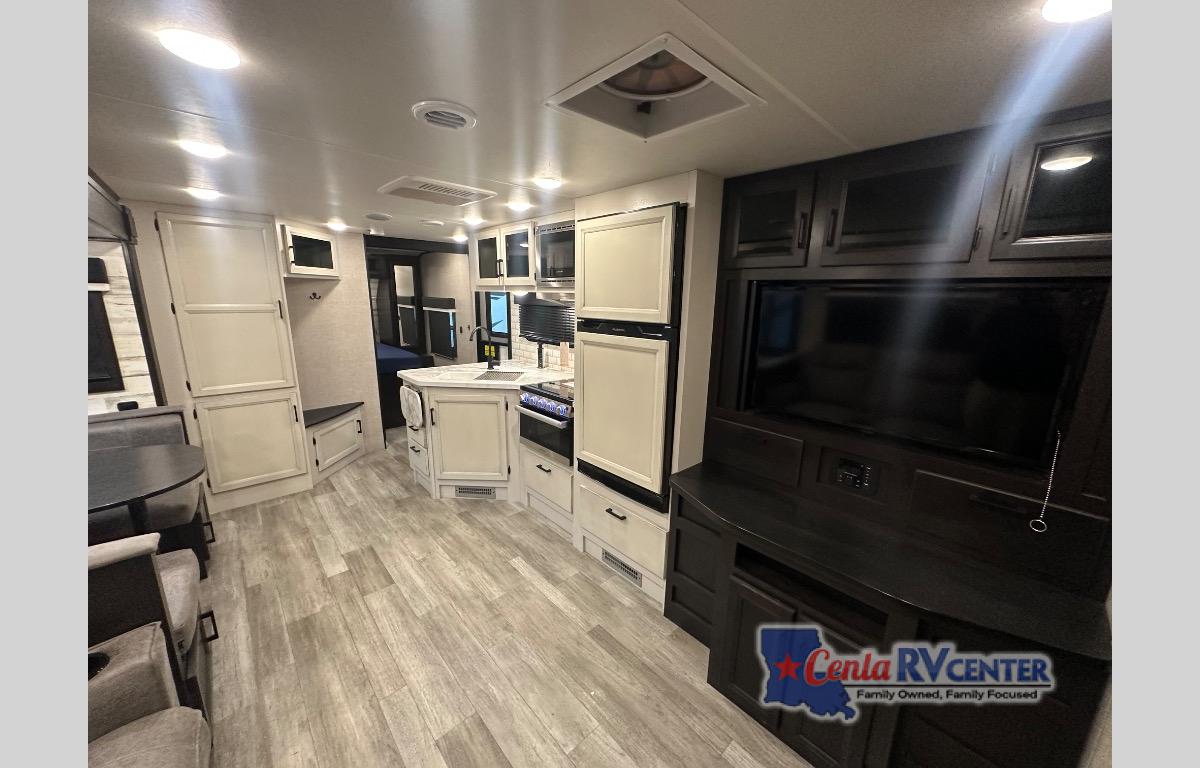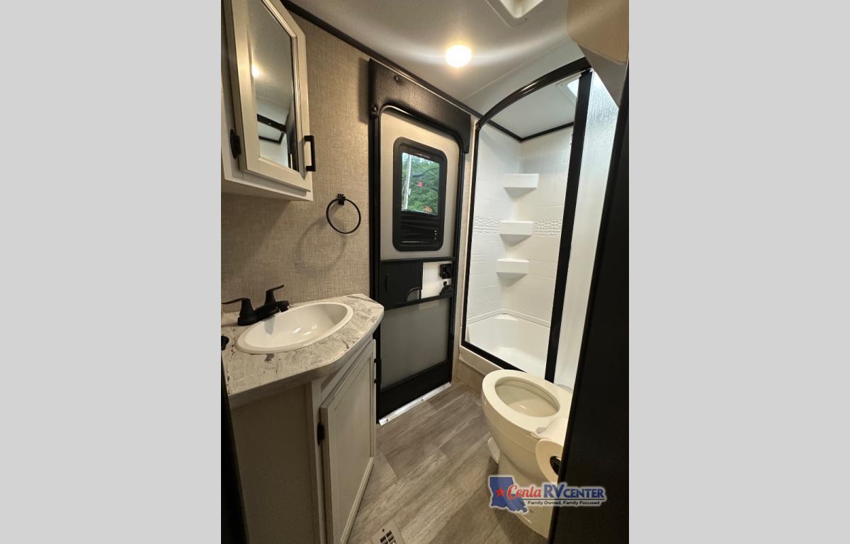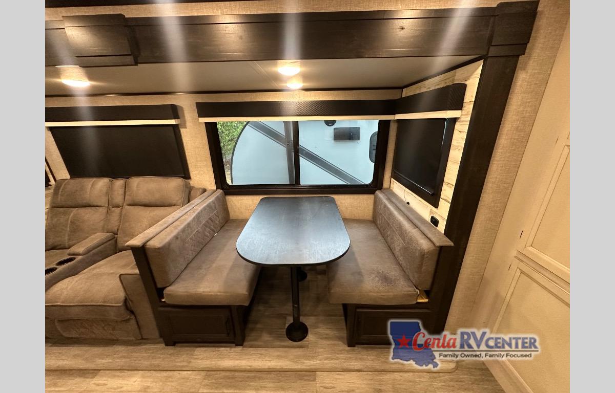 Get out and experience new campgrounds with this spacious trailer that offers a slide out jack knife sofa and booth dinette giving you dining, relaxing and sleeping space as well as more interior floor space to move from the front to the back. The dual entries are a great feature as well when you have eight campers on your trip. And having the second exterior entry/exit to the full bathroom is convenient for all. The cook will love the choice of making meals inside with full amenities or on the outside kitchen when relaxing under the 21' power awning with LED lights. And the front bedroom gives you a queen bed, dual wardrobes and windows for great views when inside. You might like to choose a few options such as theater seating or a tri-fold sofa in place of the jack knife sofa, the 120V heated tank pads for those cooler camping trips, and/or the Solar Power package if you want to camp off-grid.