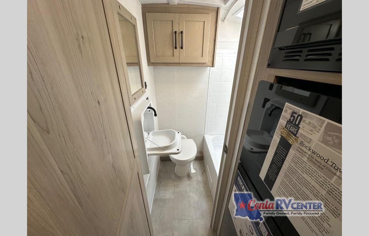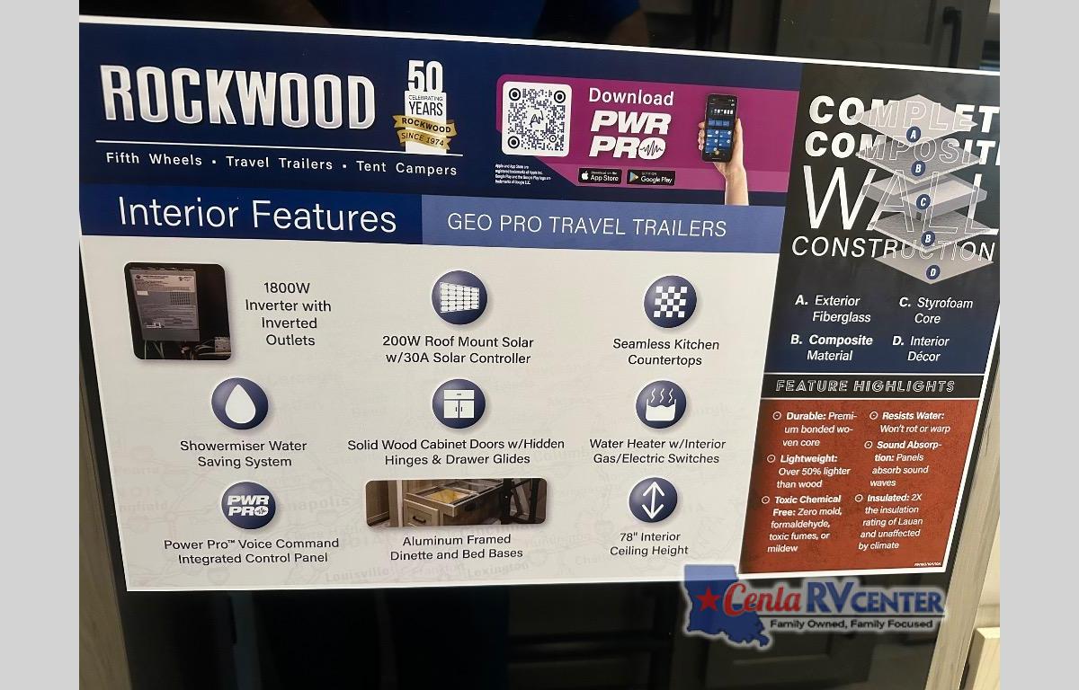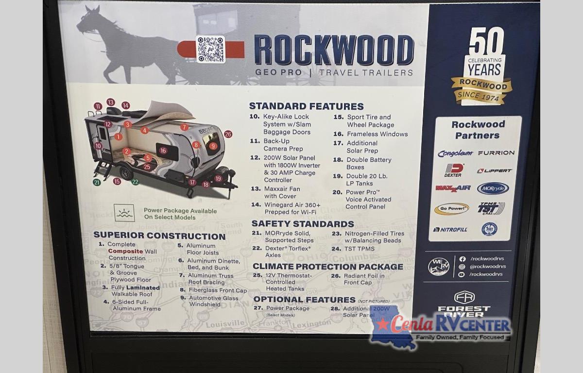 With any Rockwood GEO Pro travel trailer by Forest River you will enjoy easy towing, durable construction, and off-road capabilities with larger 15" tires and a lift kit! Each model is constructed with complete composite wall construction for added strength and durability, and the torsion axle, Rubber-Ryde suspension will make towing easier than ever. Inside, you'll find sleek roller shades for added privacy, a 12V refrigerator and a microwave, plus a 20,000 BTU furnace to keep you warm during the colder camping months.