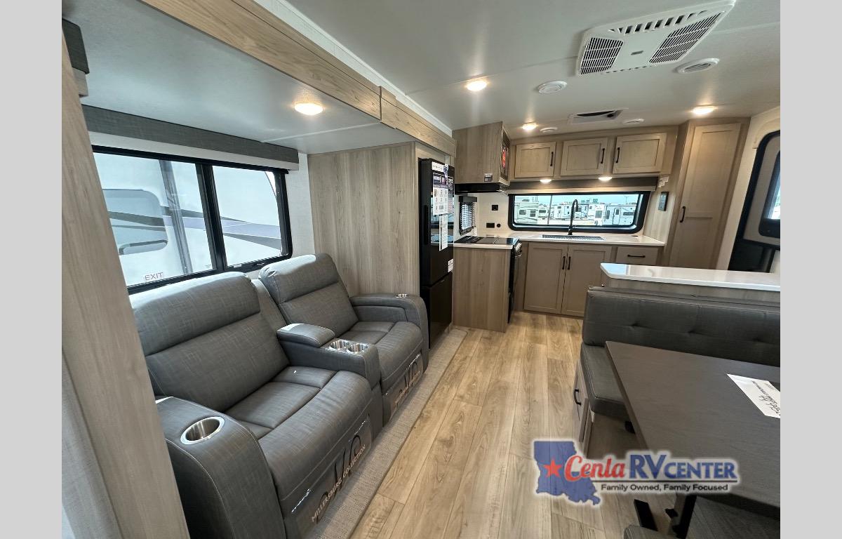 Wherever you decide to camp, you can be sure to enjoy your time in this double slide out trailer! The chef of your group will love having a front kitchen with generous counter space plus an exterior griddle when the weather is nice. There is also a 21' awning outdoors, along with Solid Entry Steps, and dual entry doors! A 39" booth dinette provides a place to dine or play a card game after dinner, and the theater seat across from the 40" TV is perfect for movie night. The walk-thru bath leads to the rear master bedroom where you'll find a queen bed, a large wardrobe, and a TV option if you enjoy shows in bed!