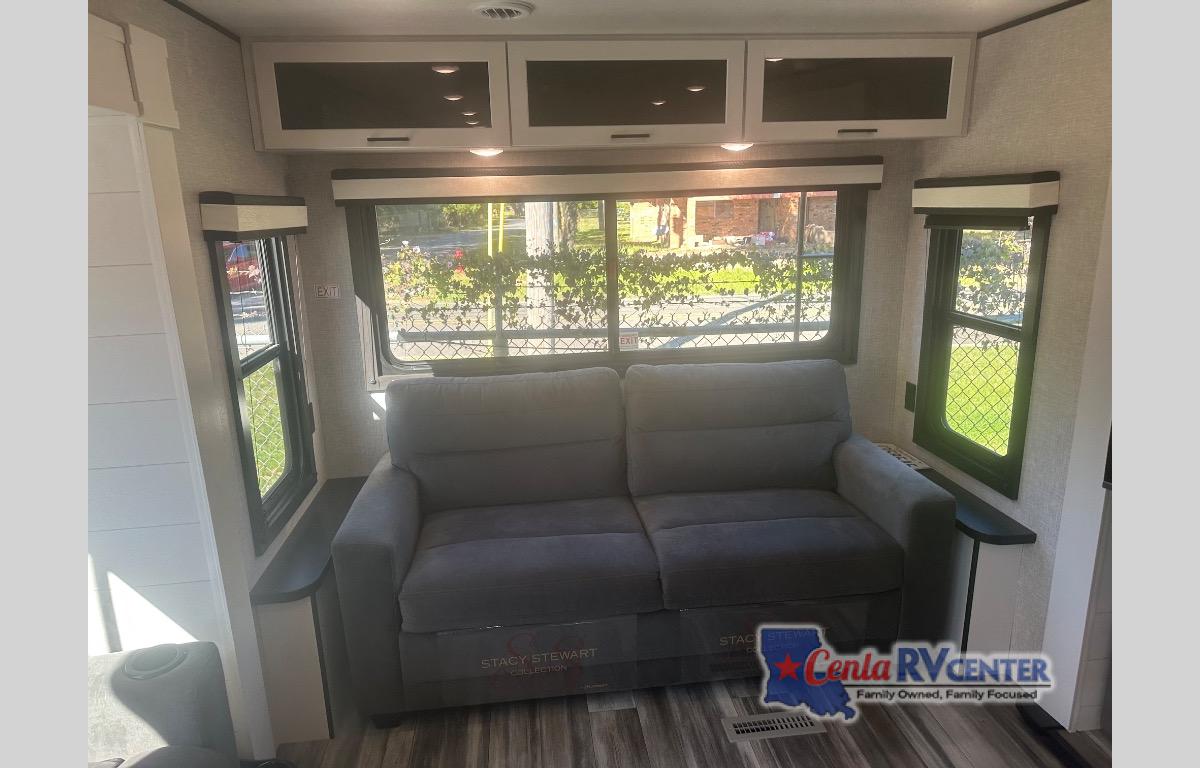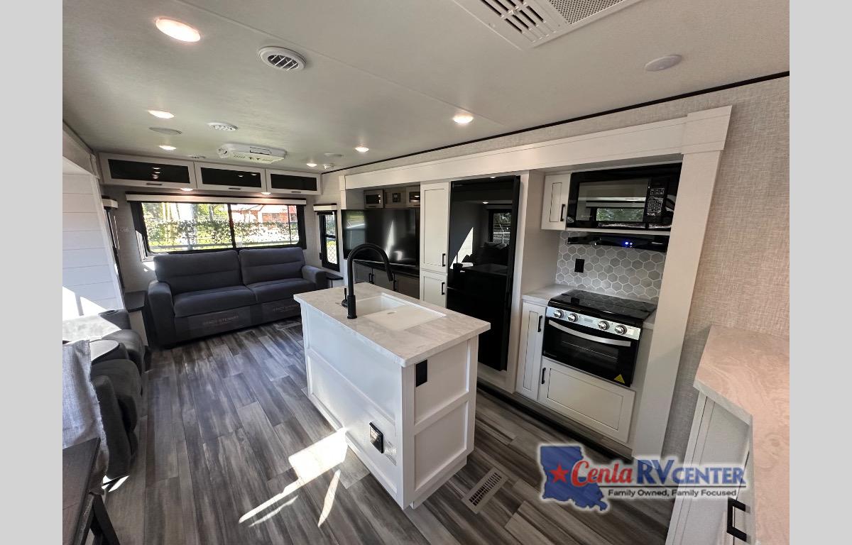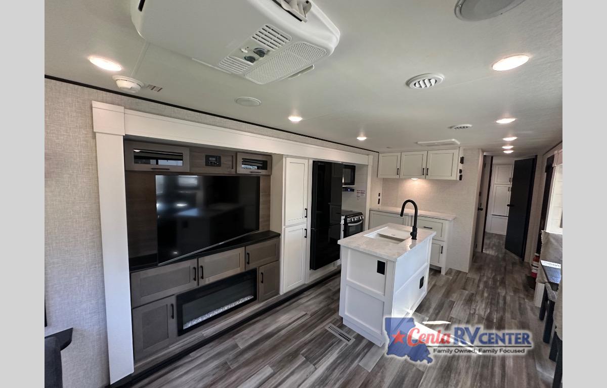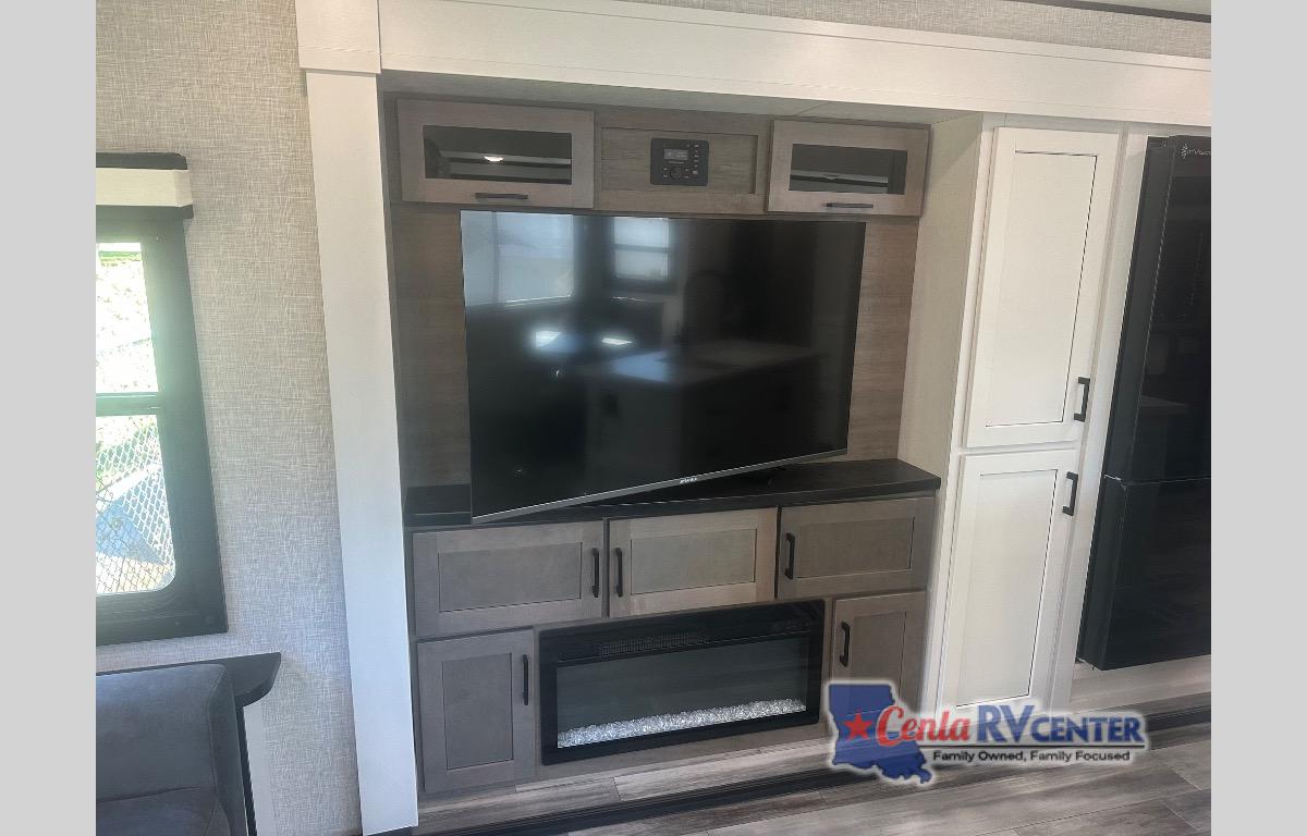 Enjoy a relaxing weekend getaway in this travel trailer! The dual entry bathroom with radius shower creates a front master suite with a queen bed slide, a dresser, and a front large wardrobe with storage space plus washer and dryer prep. The chef will have an easy time preparing their best home cooked meals with the kitchen island, hutch, three burner cooktop, and 12V refrigerator. Enjoy your meals at the booth dinette then play a card game or transform it into an extra sleeping space. The rear living area has a rear Jack-knife sofa for a quick afternoon nap and theater seating across from the entertainment center with a fireplace for the perfect spot on movie night!