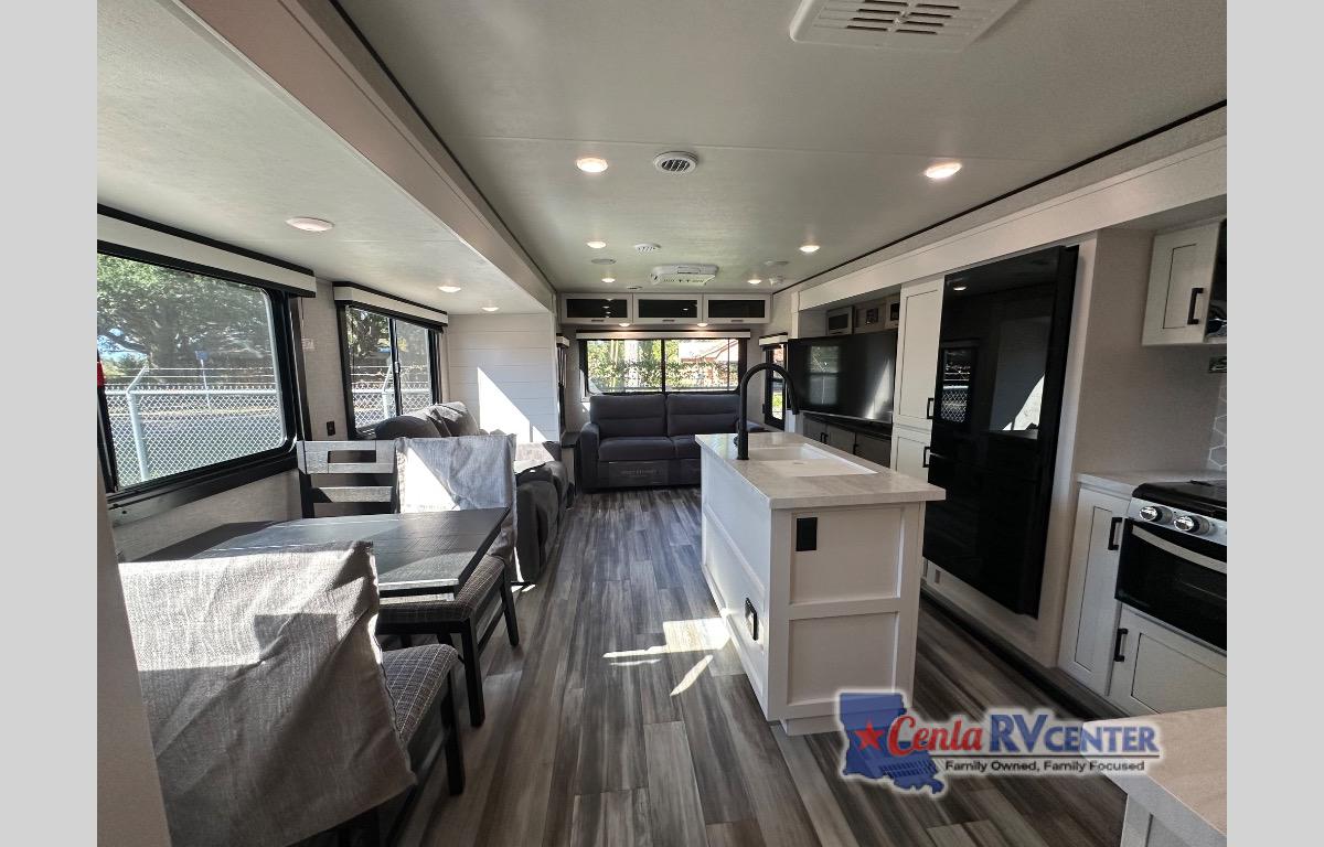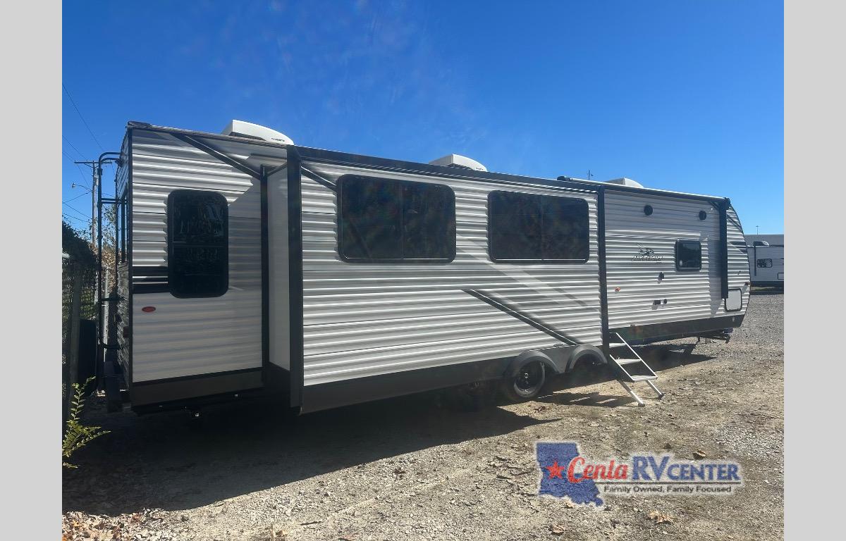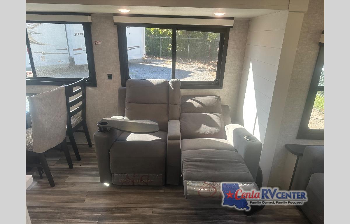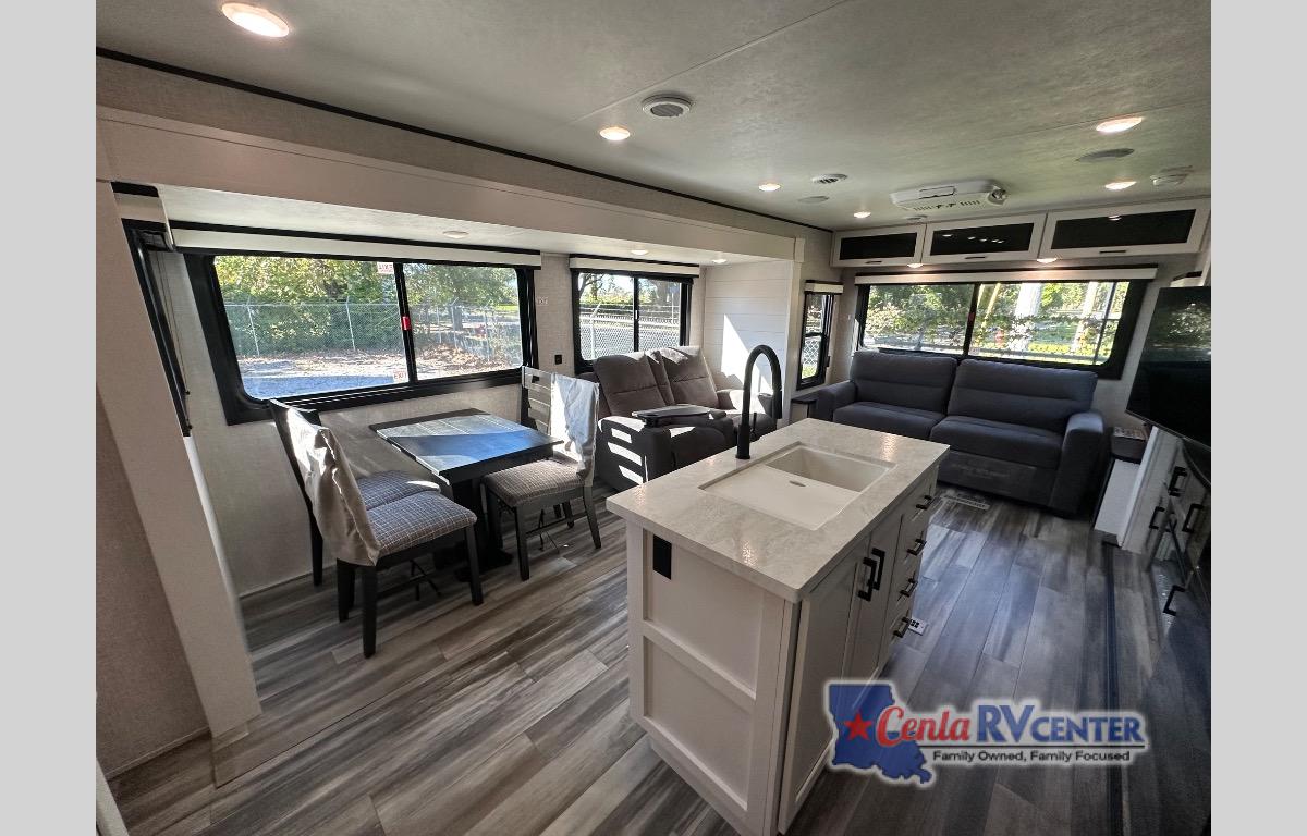 Enjoy a relaxing weekend getaway in this travel trailer! The dual entry bathroom with radius shower creates a front master suite with a queen bed slide, a dresser, and a front large wardrobe with storage space plus washer and dryer prep. The chef will have an easy time preparing their best home cooked meals with the kitchen island, hutch, three burner cooktop, and 12V refrigerator. Enjoy your meals at the booth dinette then play a card game or transform it into an extra sleeping space. The rear living area has a rear Jack-knife sofa for a quick afternoon nap and theater seating across from the entertainment center with a fireplace for the perfect spot on movie night!