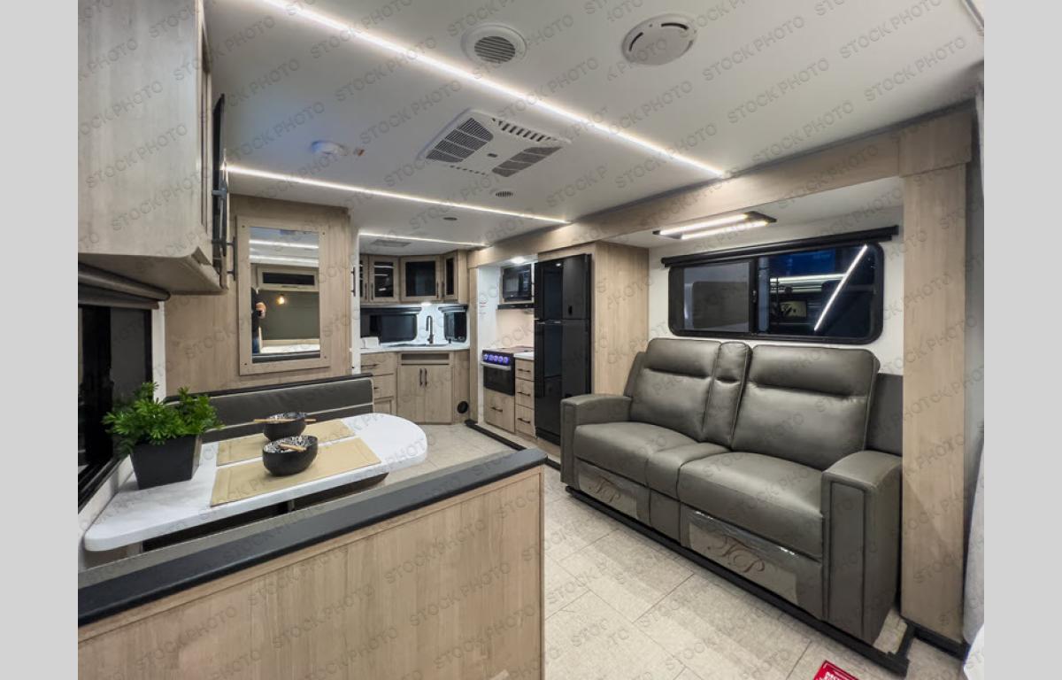 This Imagine XLS travel trailer has theater seating and a booth dinette that you can use any time you need a little break from the outdoors. If you want to come in and grab a coffee, put together a puzzle, or work on your itinerary for the week, just put up your feet and relax. You could even switch on the LED HDTV if you want a little entertainment. The front queen-size bed has a privacy curtain that you can draw to create a semi-private bedroom, and in the back of the trailer you will find the rest of your amenities, like the kitchen and the bathroom. The large slide makes it easy to enjoy spending your time indoors, but if you do want to get back outside, you can sit underneath the 18' electric awning for some shade.